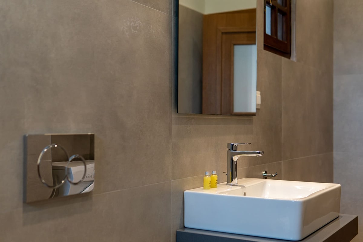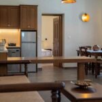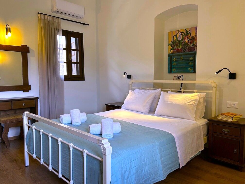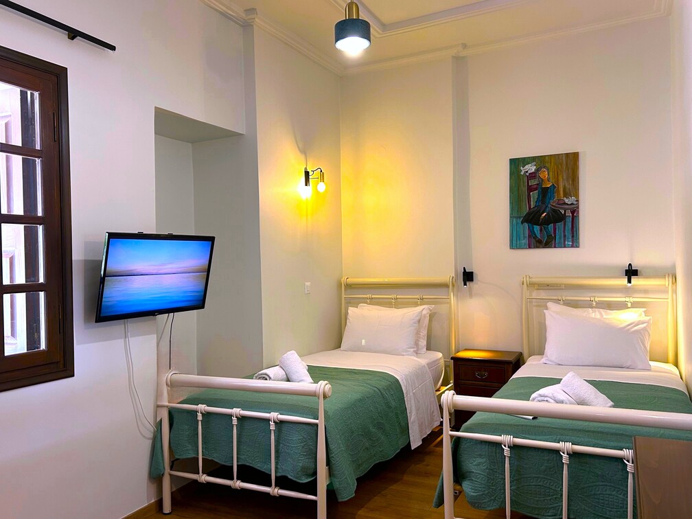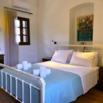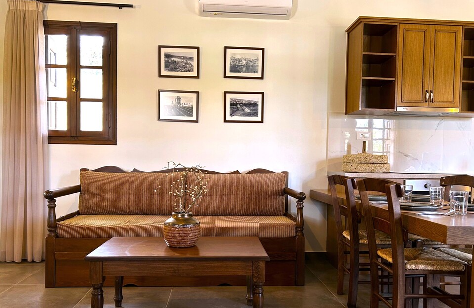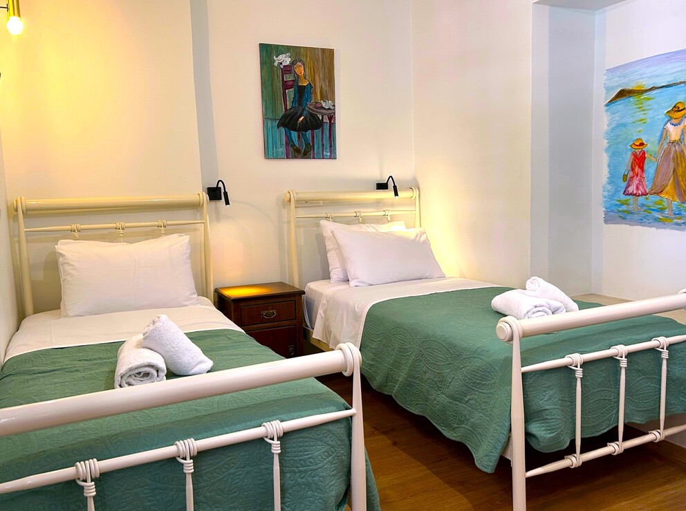 Experience Olga, our charming and spacious suite. Featuring two bedrooms — one with a comfortable double bed and the other with two single beds that can be transformed into a double using a topper mattress — plus a sofa bed featuring a folding mechanism, Olga accommodates up to 6 guests. With two bathrooms, convenience and privacy are assured during your stay. Step outside to discover the inviting yard, providing a delightful space to relax and unwind. Olga is equipped with a washing machine and a dishwasher, adding ease to your daily routine. For your convenience, the suite includes appliances such as a coffee maker, toaster, kettle, and hairdryer. A sink and a fully equipped kitchen — including plates, glasses, cutlery, and pots — are provided. Enjoy a tranquil atmosphere with sound insulation, ensuring a peaceful and enjoyable stay in Olga.